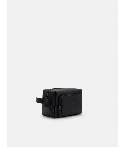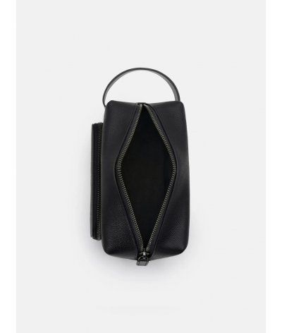 Structured in embossed leather, this boxy pouch redefines essential carry with precision. Zippered compartments and a single handle offer functional clarity, while its clean lines and considered proportions translate everyday utility into a subtle statement of contemporary, design-led sophistication.