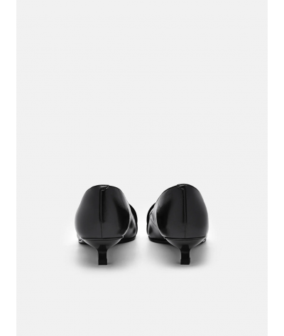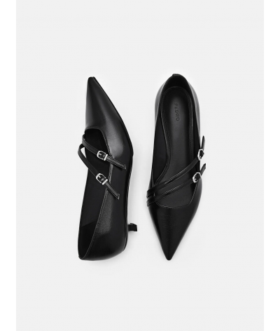 A modern reinterpretation of a classic silhouette, these pumps feature a wrinkled upper for texture. The strappy design and buckle hardware add modernity, with a comfortable heel.