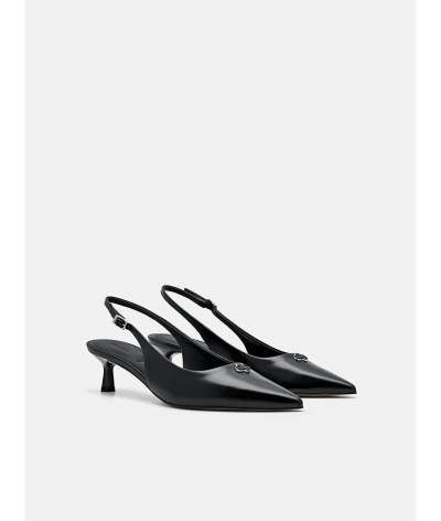 Sleek and sculptural, the Leather Slingback Heel Pumps balance modern proportion with quiet detail. Crafted from supple calf leather, the pointed toe and curved comma heel create a silhouette that feels both directional and grounded. A subtle nod to identity comes through in the refined monogram hardware.