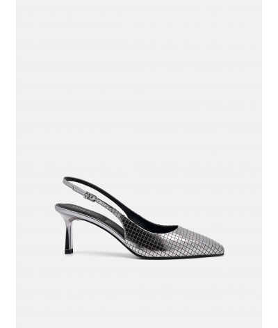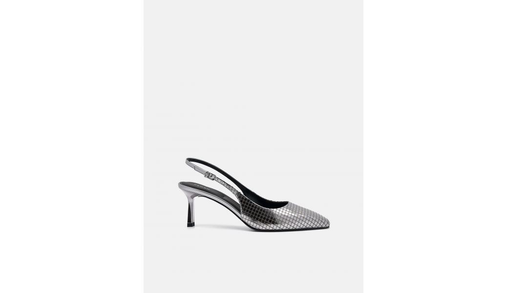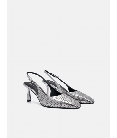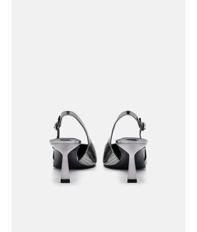 The Metallic Leather Slingback Pumps blend futuristic edge with refined craftsmanship. Crafted from metallic kid leather, the laser-cut grid nods to digital minimalism. Squared toe and slim post heel balance modern form, while the monogram-embellished ankle strap secures with confidence, a sleek statement from day to night.