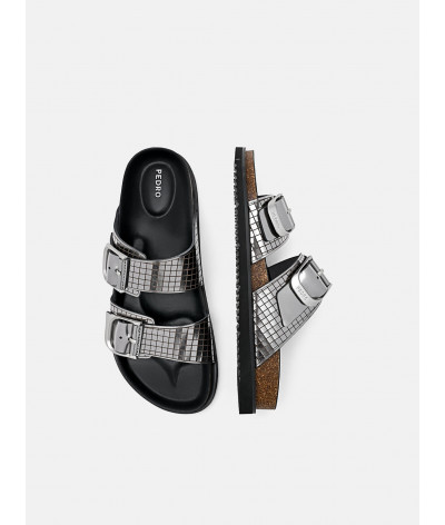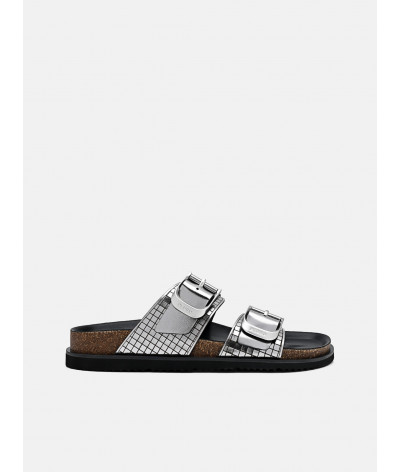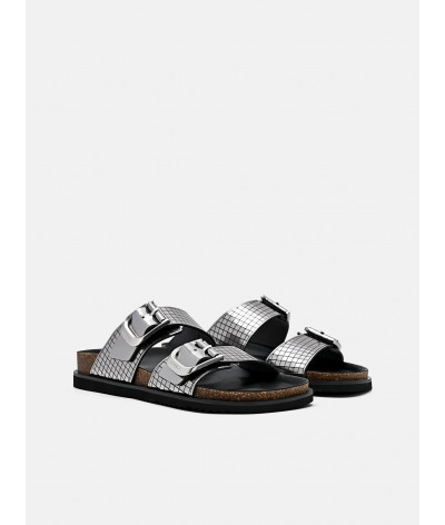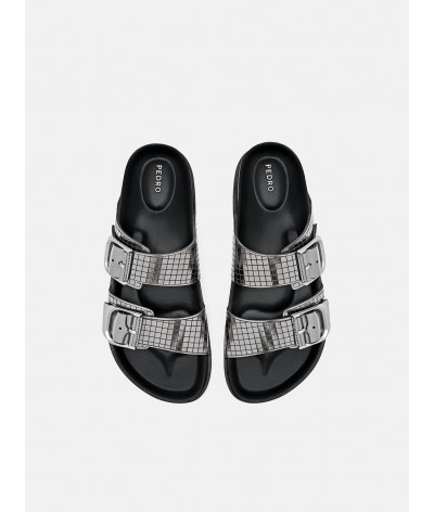 The Helix Metallic Leather Sandals channel a future-forward aesthetic with material intelligence and bold restraint. Crafted from kid leather with a high-shine metallic finish, the lasercut grid pattern introduces a tech-industrial edge, balancing form and function. Double buckle bands secure the upper with engineered precision, while a chunky sole grounds the silhouette in utilitarian cool.